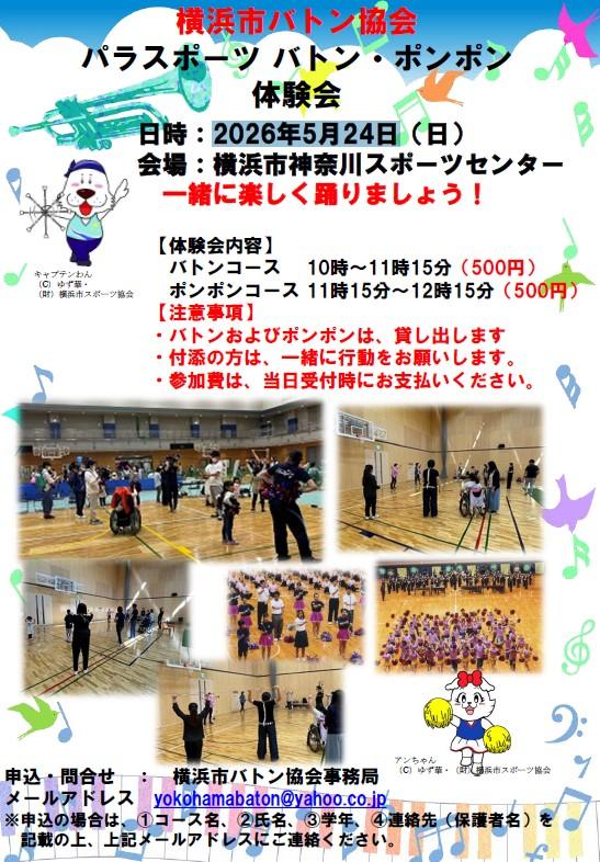 横浜市バトン協会では、令和8年5月24日(日)にパラスポーツ バトン・ポンポン体験会を開催します。現在、参加者を募集しています。詳細は、体験会チラシをご覧ください。お申込みは、①コース名、②氏名、③学年、④連絡先(保護者名)